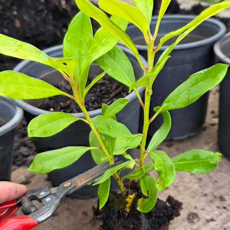 It’s also one of the nicest jobs to be doing in summer. I’m tucked away under the shade of the cherry trees, birds singing away, music playing, and trays of young rhododendrons lined up waiting their turn. It’s quiet, repetitive, and oddly satisfying — and it’s all part of raising strong, well-shaped plants that will thrive in your garden for years to come.