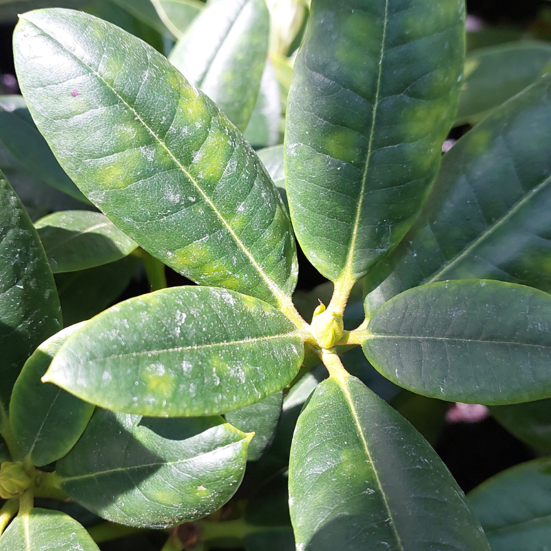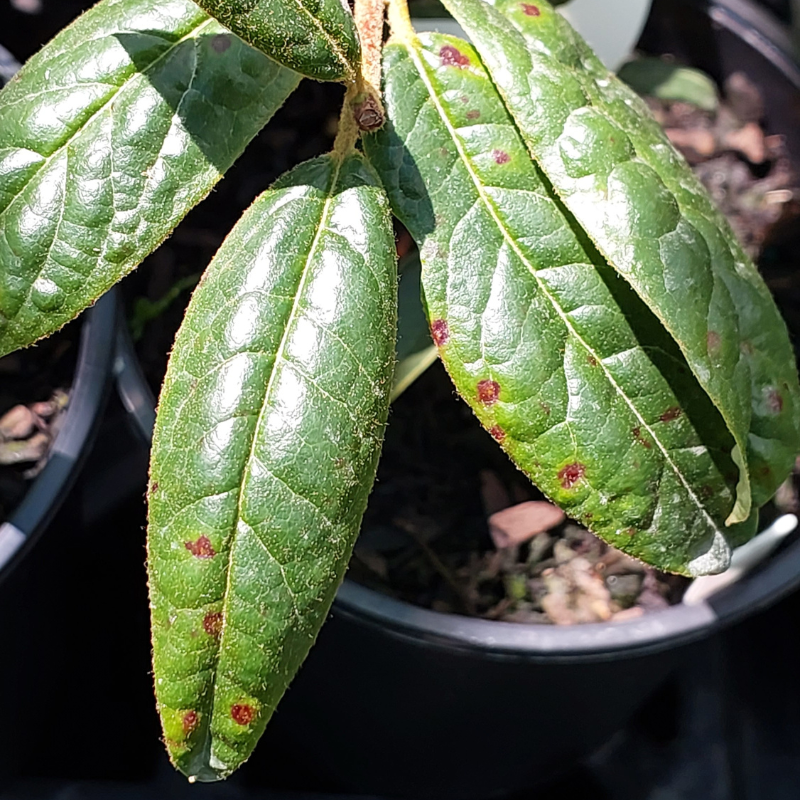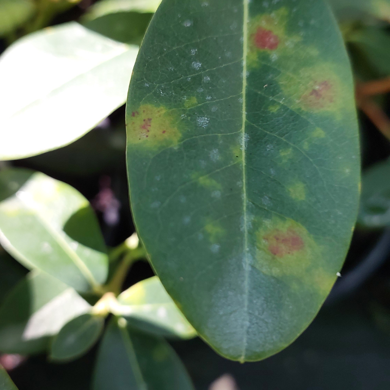 - Black spotting is the first sign of fungus infection on fragrant leaves of the Princess Alice, John Bull, etc and Trewithian Orange rhododendrons