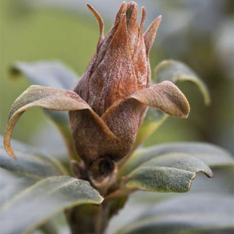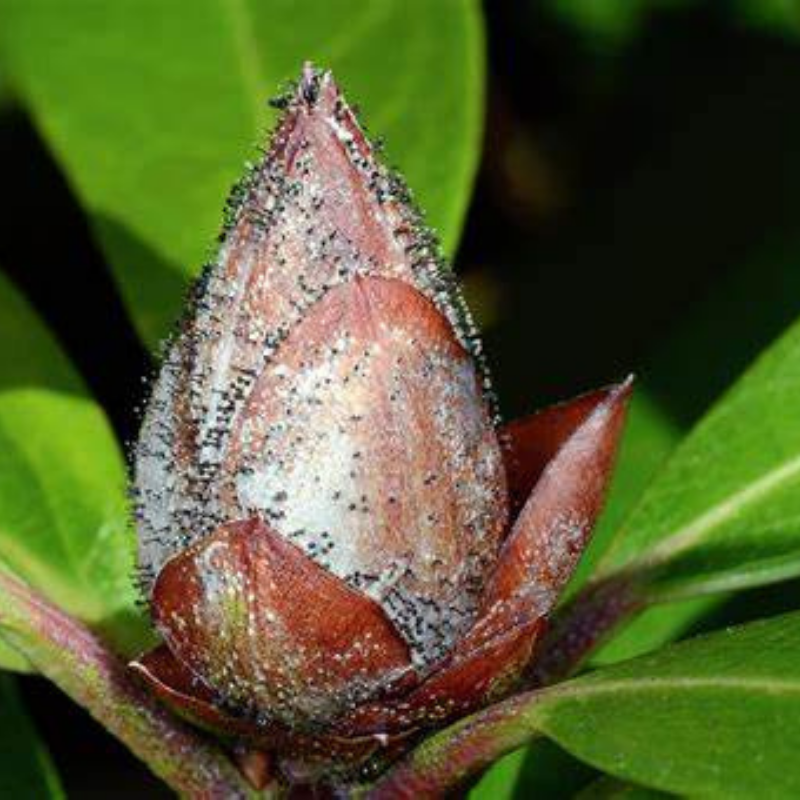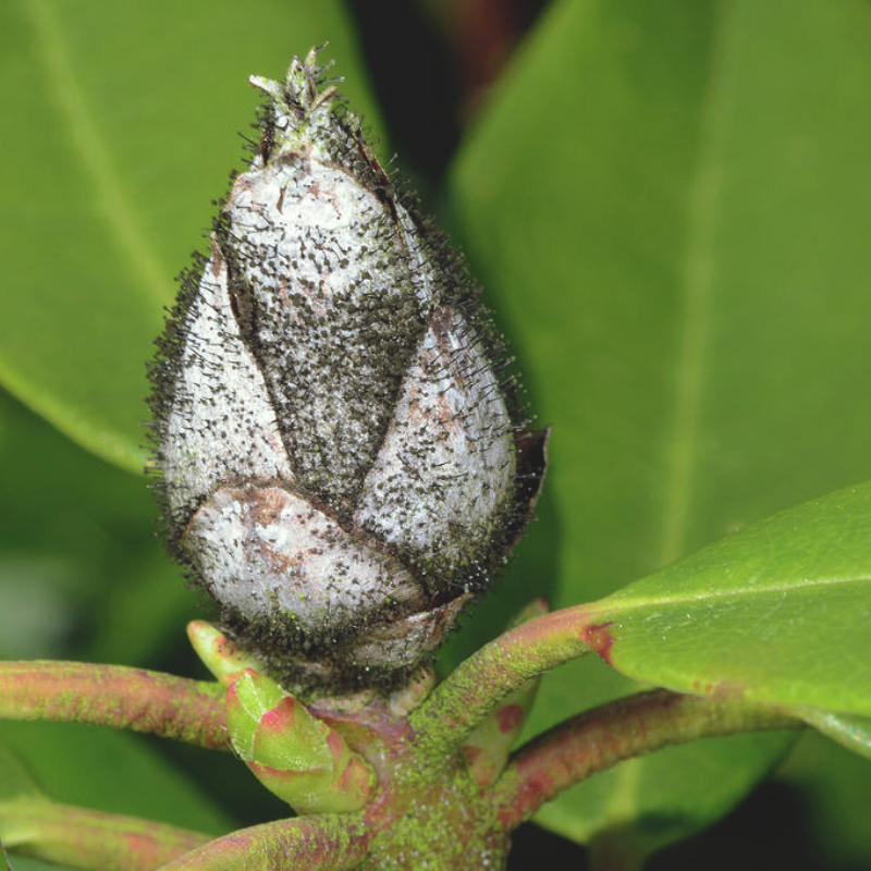 Bud blast is a common fungal disease in rhododendrons that primarily targets the flower buds, preventing them from blooming. The disease is caused by the fungus Seifertia azaleae, which results in the death of developing buds. Affected buds may turn brown, black, or silvery grey, depending on the variety, and will eventually dry out, but they remain attached to the plant, becoming unsightly. Over time, these buds develop small black fungal bristles (setae) that cover them, which is one of the tell-tale signs of bud blast.