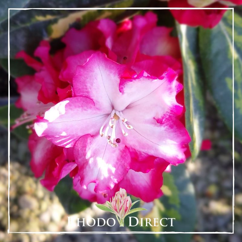 Rhododendron President Roosevelt has variegated foliage which most will recognised with dark red edged white flowers. Height 1.2m Flowering in September